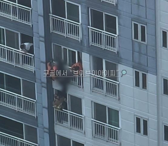 아파트 23층 난간에 거꾸로 매달린 여성... 소방 대원들에 극적 구조