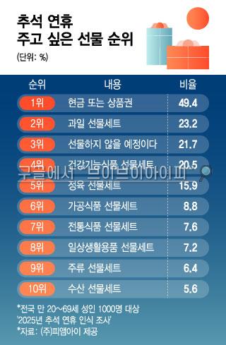 데이터 컨설팅 기업 피앰아이(PMI)가 추석을 앞두고 전국 만 20~69세 남녀 1000명을 대상으로 한 '추석 연휴 인식 조사'를 한 결과에 따르면 올해 선호하는 추석 선물로 현금·상품권(49.4%) 응답률이 가장 높았다. 과일선물세트(23.2%)이 그 뒤를 이었다.