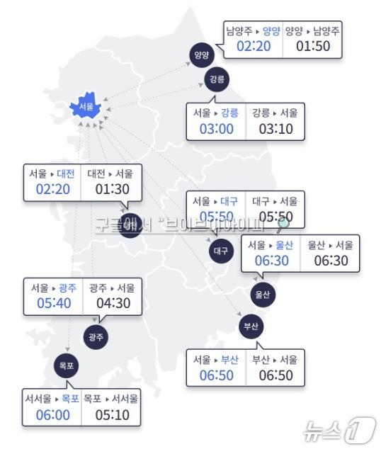 지방에서 서울까지는 △부산 6시간 50분 △울산 6시간 30분 △강릉 3시간 10분 △양양 1시간 50분(남양주 도착) △대전 1시간 30분 △광주 4시간 30분 △목포 5시간 10분(서서울 도착) △대구 5시간 50분이 걸릴 것으로 예상된다.