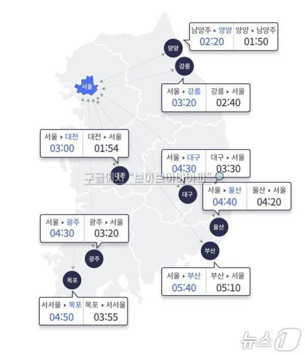 같은 시각 지방 주요 도시에서 서울까지는 △부산 5시간 10분 △울산 4시간 20분 △강릉 2시간 40분 △양양 1시간 50분(남양주 도착) △대전 1시간 54분 △광주 3시간 20분 △목포 3시간 55분(서서울 도착) △대구 3시간 30분이 걸리겠다.