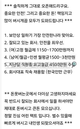 또 "감금·폭행 같은 말도 안 되는 일은 없고 쓸데없이 그런 의미 없는 짓을 하지도 않는다"며 "안전 걱정할 필요가 없을 정도로 회사 운영진들은 오직 같이 일해서 서로 돈 많이 벌자는 '윈윈' 마인드뿐"이라고 내세우기도 했다.