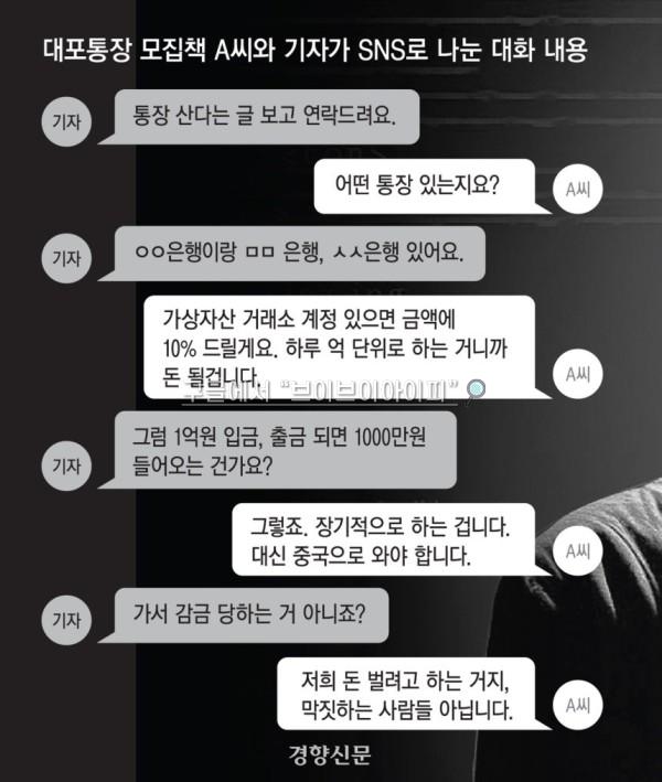 캄보디아 사건이 이슈가 된 뒤에도 대포통장 거래는 활발하게 이뤄지고 있었습니다. 경향신문이 한 포털 사이트에 ‘통장 삽니다’라고 검색해보니 모집책들이 쓴 불법 광고 글이 무더기로 나왔습니다. 그중 한 명인 모집책 A씨와 연락이 닿았습니다. A씨는 기자에게 ‘어떤 통장을 가지고 있느냐’거나 ‘가상자산 거래소 계정이 있느냐’고 물었습니다.