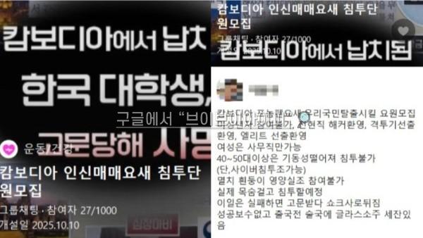 지난 10일 한 사회관계망서비스(SNS)에는 '캄보디아 인신매매요새 침투단원 모집'이라는 오픈채팅방이 개설됐다. 해당 채팅방의 소개글을 보면 '캄보디아 프놈펜에서 우리 국민 탈출시킬 요원 모집. 격투기 선수 출신 환영. 실제 목숨 걸고 침투할 예정' 이라는 내용이 있다. 여기엔 현재 27명의 인원이 모여있다.