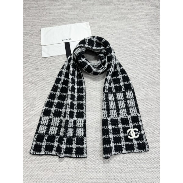 • 샤넬 25FW 25B 캐시미어 머플러 체크 CC로고 스톨 블랙 화이트 울 실크 AAB257 #타지아